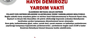 Bugün sabaha karşı meydana gelen ve merkez üssü Kahramanmaraş’ın Pazarcık ilçesi olan, Bayburt ve birçok ilde hissedilen 10 şehrin etkilendiği depremin ardından Belediyemiz tarafından yardım kampanyası düzenlenmesi kararı alınmıştır. Kuru gıda, kullanılmamış giysi, ısıtıcı, çocuk bezi, çocuk maması ve battaniye yardımlarının yapılacağı kampanya kapsamında yardımseverler; yardımlarını bugün saat 14.00’a kadarDemirözü Belediyesi hizmet binasına teslim edebilirsiniz.
